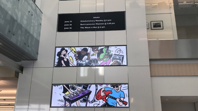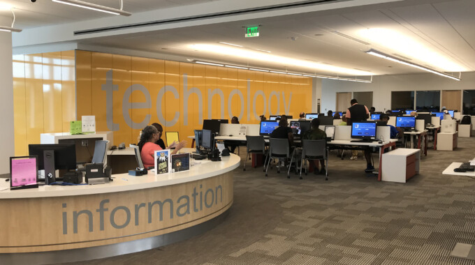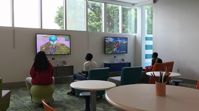 As the most modern library in the state upon completing renovations, the facility also features a maker space with a 3D printer and sewing machine, various meeting rooms with monitors and videoconferencing capabilities, a 40-seat meeting and event space that boasts cinema-style viewing and a surround sound system, an audio production room with sound recording software, a 20-seat computer literacy training lab, 90 computers for public access, and a teen zone with flexible seating, computer area, and video game lounge.