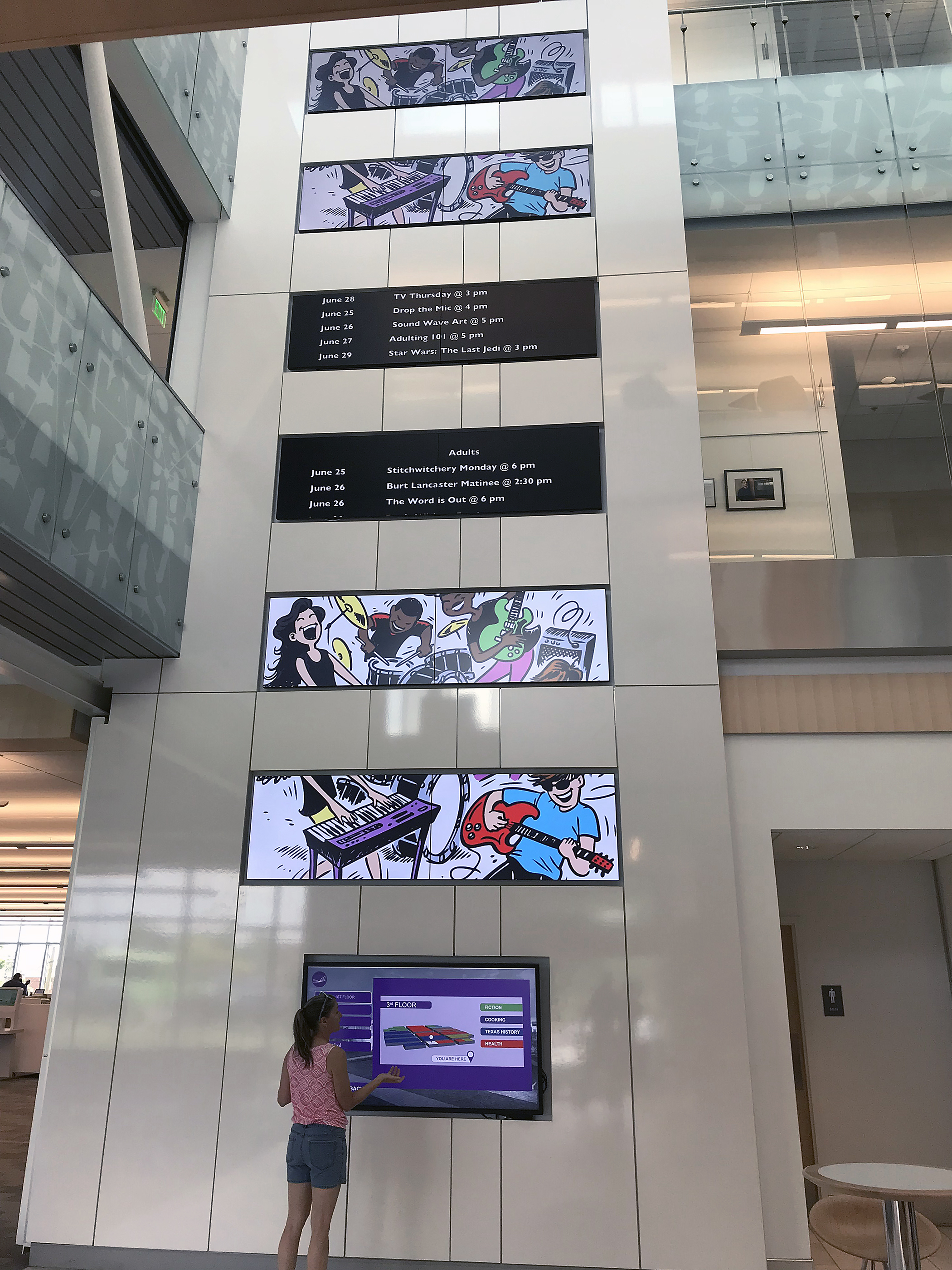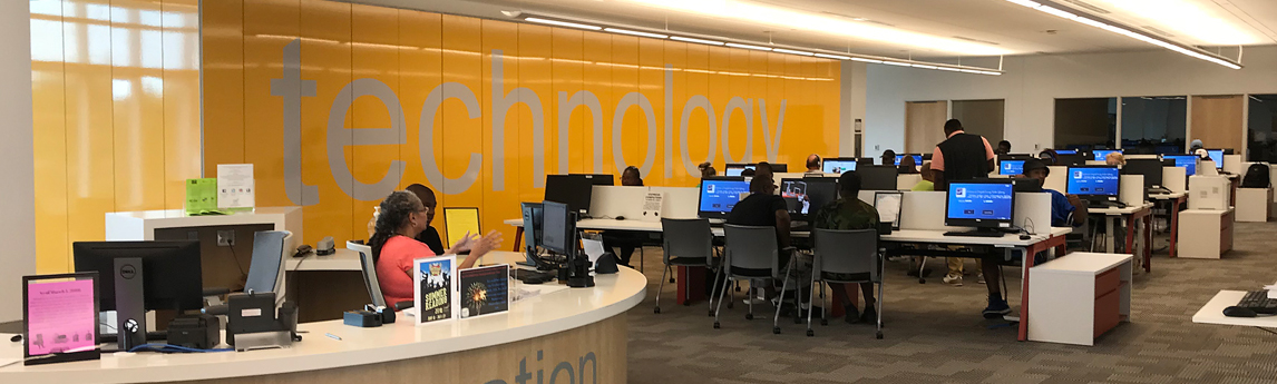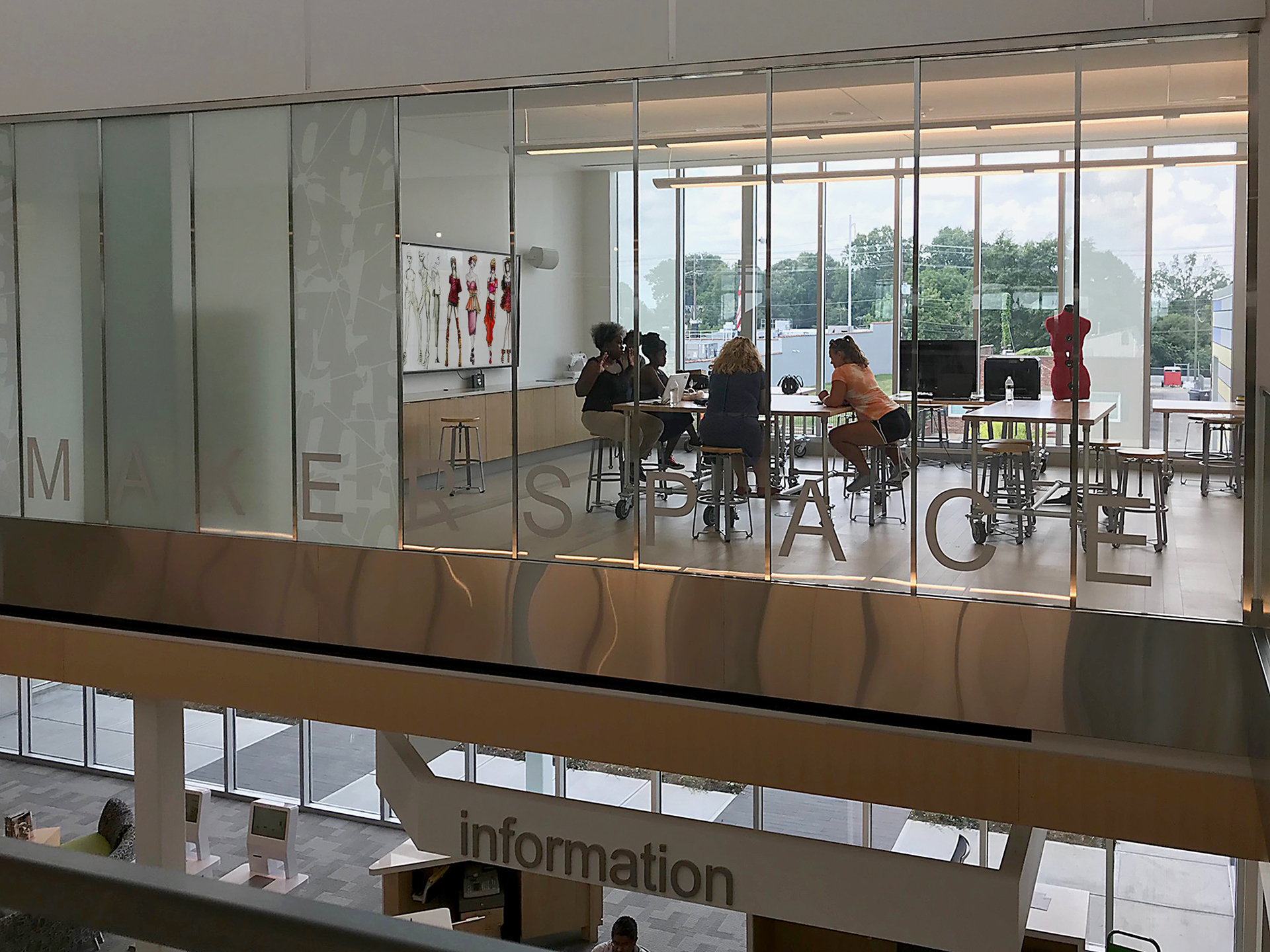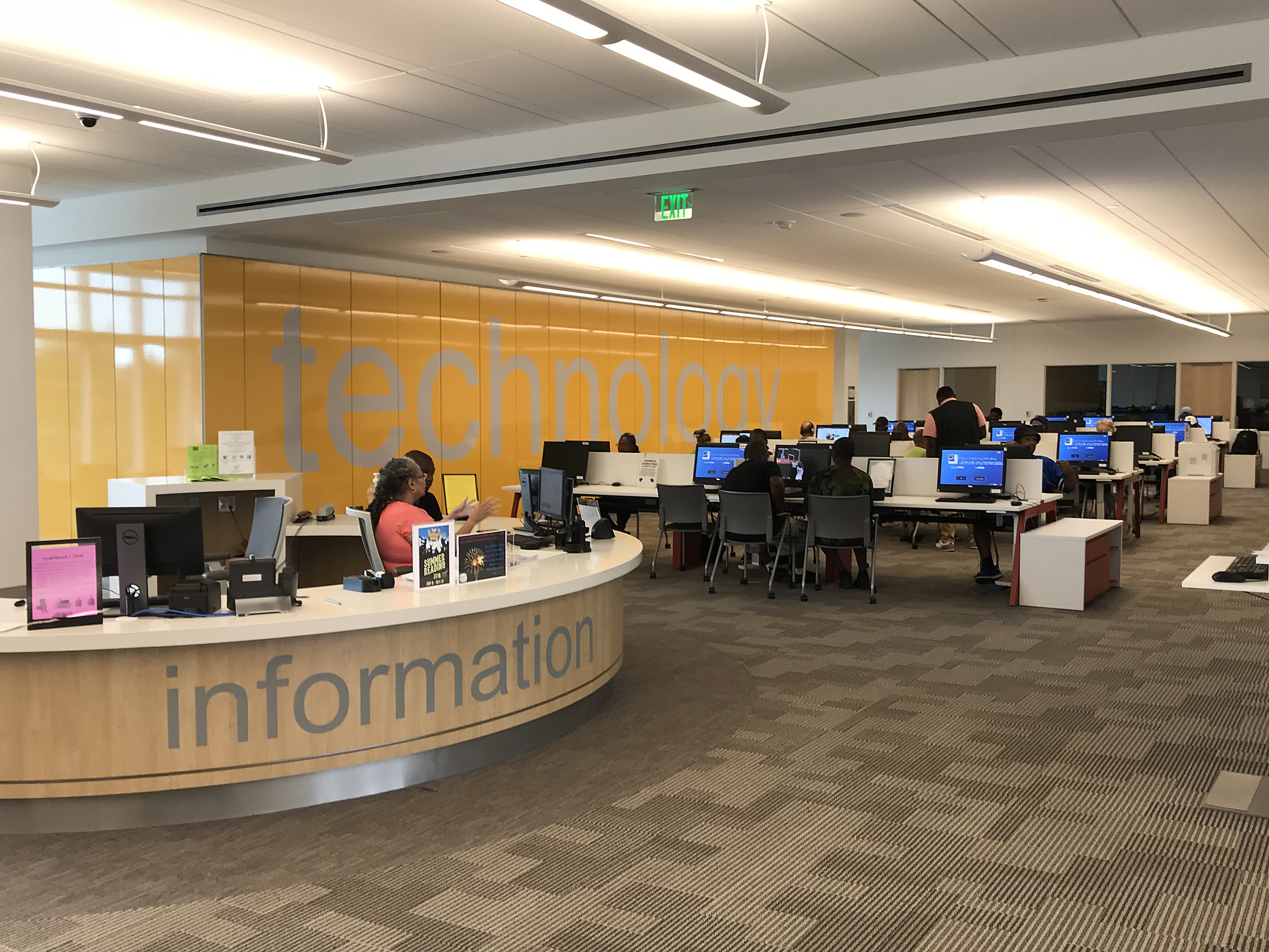 As the most modern library in the state upon completing renovations, the facility also features a maker space with a 3D printer and sewing machine, various meeting rooms with monitors and videoconferencing capabilities, a 40-seat meeting and event space that boasts cinema-style viewing and a surround sound system, an audio production room with sound recording software, a 20-seat computer literacy training lab, 90 computers for public access, and a teen zone with flexible seating, computer area, and video game lounge.