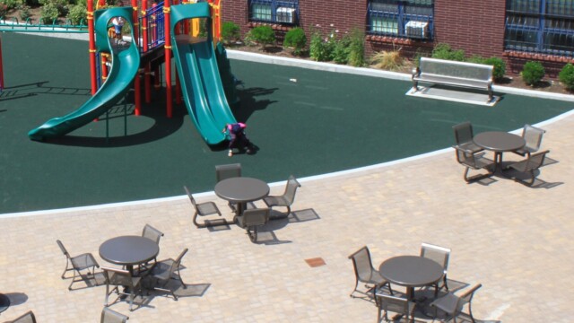 The yard includes a playground and a seating area that features decorative pavers, tables, and benches, surrounded by flowering shrubs and shade trees that screen it from the private on-site parking area.