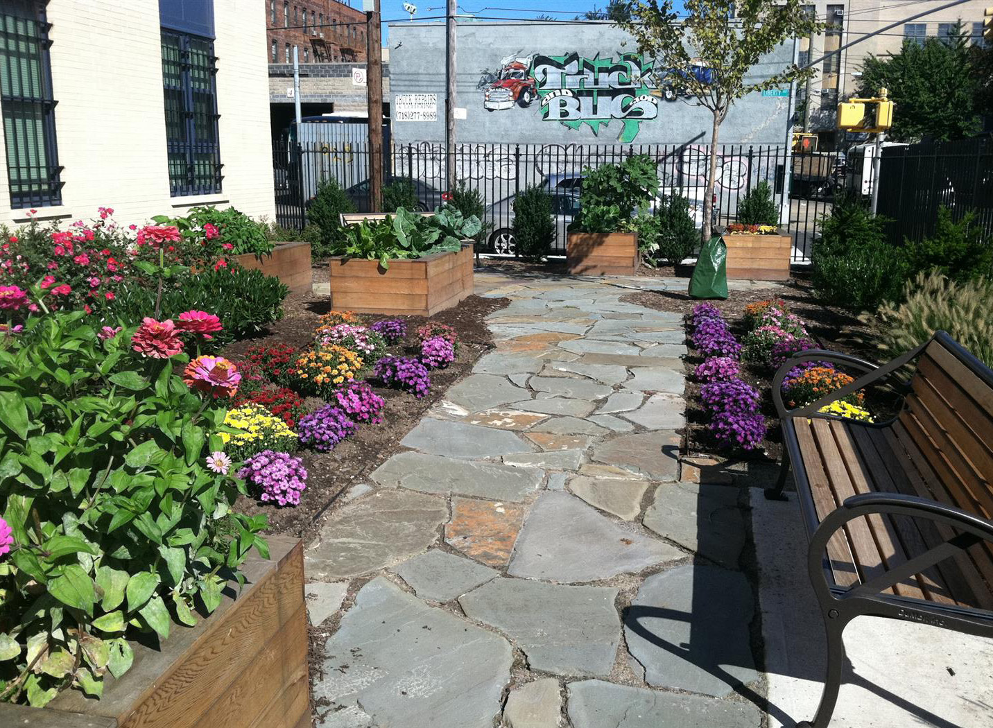 The design also incorporates a secluded “secret garden” with custom wood planters and fieldstone pathways surrounded by densely planted flowering gardens.