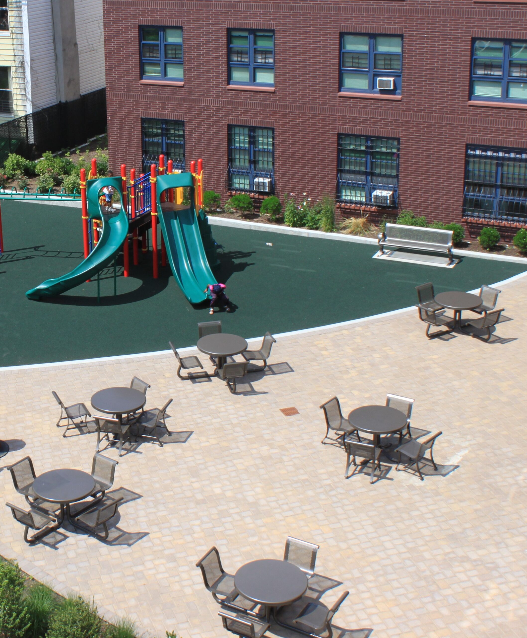 The yard includes a playground and a seating area that features decorative pavers, tables, and benches, surrounded by flowering shrubs and shade trees that screen it from the private on-site parking area.