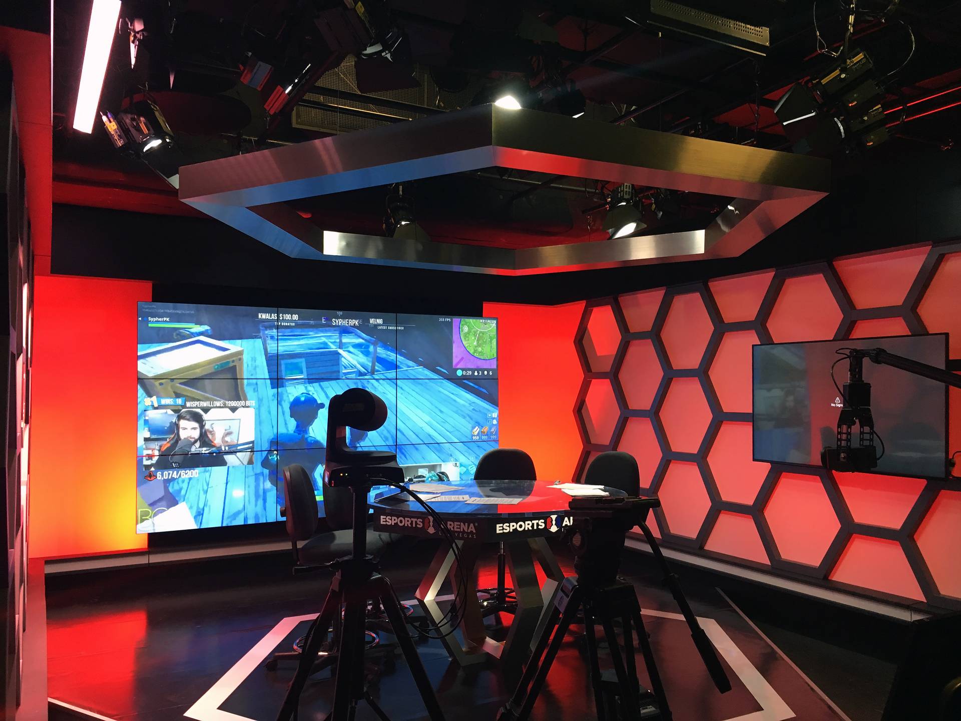 NV5 used extremely slim and low-profile lighting fixtures integrated into the players’ stations (referred to as “Player Pods”) to the left and right of each player. By experimenting with various source angles, distracting glare to the players was avoided while still achieving a nice illumination on their faces — even when players were wearing ball caps or hoods that would otherwise shadow their faces from the overhead lighting. The very bright, very large direct-view LED video wall so close to the players posed several unique challenges in lighting to broadcast quality. For example, all stage lighting had to be carefully aimed to avoid throwing light onto the screen, which could deteriorate the contrast ratio and distort the color of the displayed image. Despite conflicting needs for each of these modes, the venue had to simultaneously support both a good image and experience for the live audience, as well as the online viewers. Every aspect of the lighting system was controllable, so adjustments could be further fine-tuned as needed.