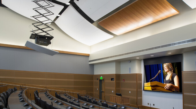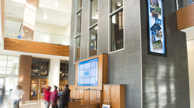 A technology-rich environment is created at the union, which achieves the objective of supplying resources for the modern student. In addition to ballrooms, the video theater, parliamentary room, conference rooms, lounges, and dining areas exemplify this concept. Large video walls and flat panel displays convey messages and current events to students and visitors. Informal TV and study lounges support the program’s social learning objectives and allow comfortable places to relax and collaborate with fellow students between classes. The Game Room incorporates traditional favorites like billiards and foosball, and even includes modern electronic console gaming.