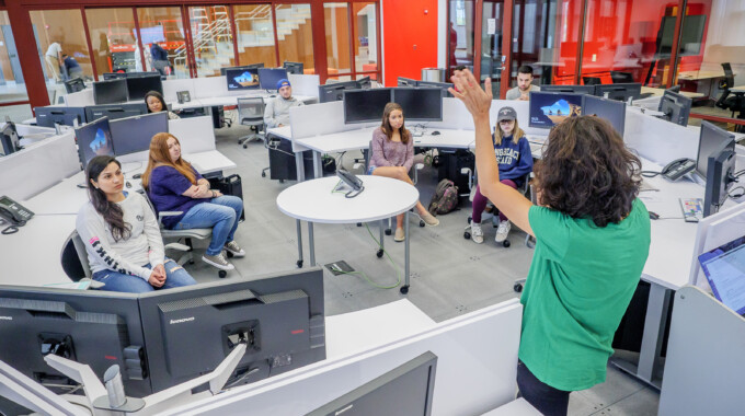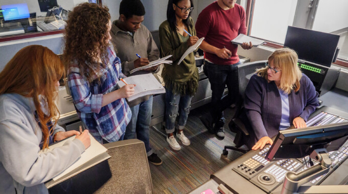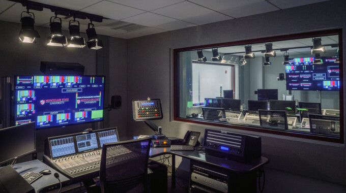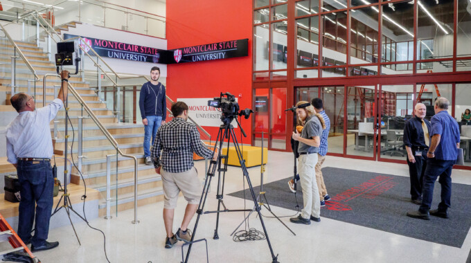 The heart of the journalism and digital media programs is the News Room of the Future. This instructional, live news “makerspace” houses upwards of 50 students, and simulates a real-life, professional news room environment. It is supported by a rapid set-up “instant news” guest interview studio, an isolated edit bay, dedicated voice-over booth, and a full-featured control room. A partnership with Sony Electronics delivers the latest technology as used in Hollywood, giving students a competitive advantage in launching their careers in the industry. Montclair State’s reputation of cutting-edge media arts programs also embraces a rich heritage of notable alumni, from Allen Ginsberg to Bruce Willis. The new School of Communications and Media Studies offers spaces teeming with technology, designed to prepare students to enter the workplace as creative and critical decision makers.