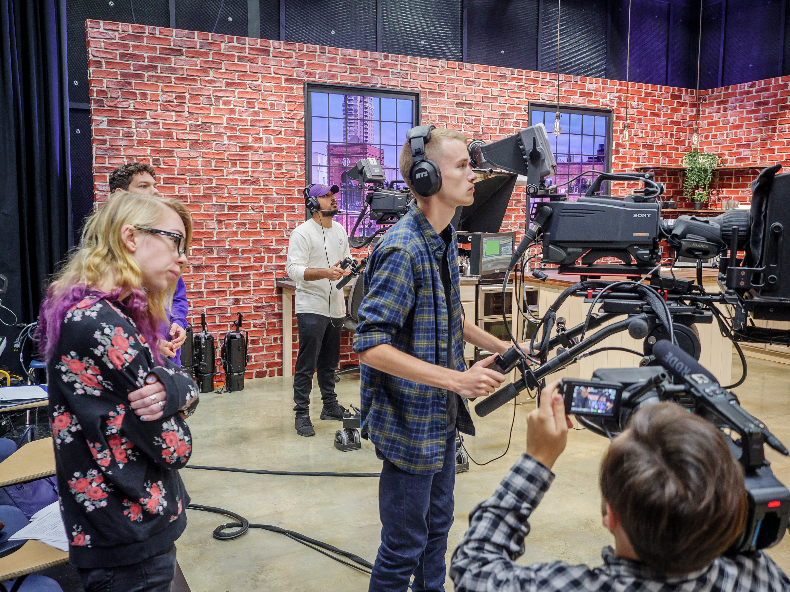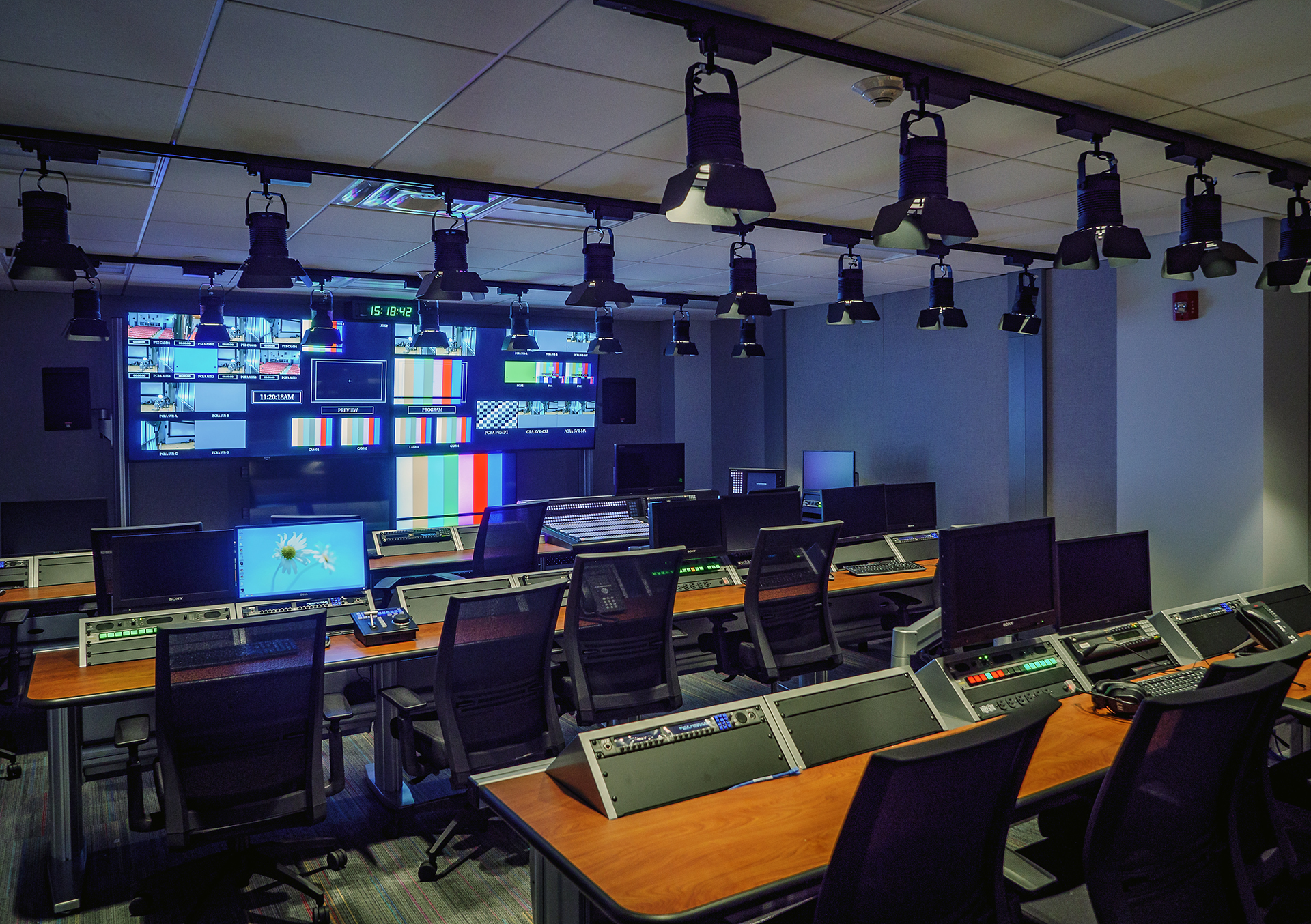 The facility features 115 student computer editing stations, two state-of-the-art HD broadcasting studios, a Human-Factors Research Lab, six high-end editing studios, a video and audio editing lab, plus instructional/research labs, offices, conference rooms, lecture hall, two screening rooms, smart classrooms, TV studios, sound stage, set shop, green rooms, dressing/make-up rooms, 16mm film editing room, film studios, and radio station. All studios are interconnected allowing for multiple, concurrent, productions.