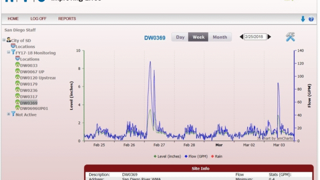 As part of an on-going project, NV5 has been deploying this flow data system in more than 30 deployments throughout the County’s MS4 network to collect accurate measurements of real-time flow rates and trends to establish baseline flow conditions, measure the effectiveness of strategies implemented toward reducing or eliminating dry weather flows and estimate pollutant load reductions. Project staff have been provided access to near real-time flow conditions via the web portal to evaluate flow patterns utilizing site-specific graphs and reports of the daily, weekly, and monthly flow patterns. The County’s staff use the data and statistics to determine when significant flows were occurring and to schedule dry weather flow observations for a higher probability of success at finding a meaningful source of the flow pattern.