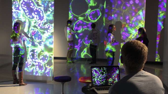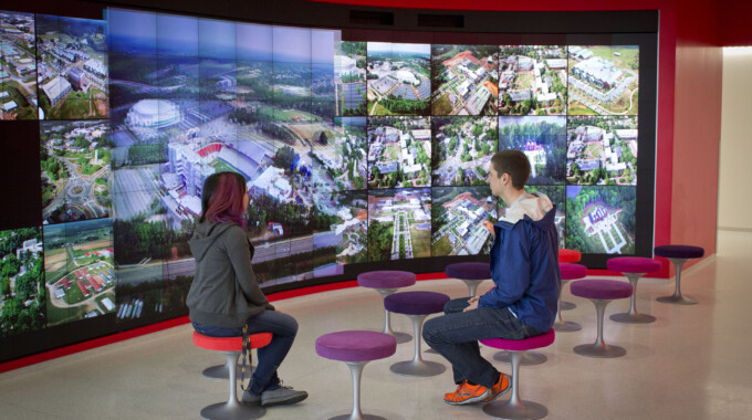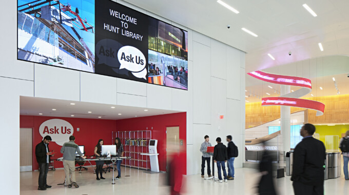 In the new 218,000 SF Hunt Library, NC State seeks nothing less than to create the best learning and collaborative space in the country. The signature, iconic building is being designed to promote interaction and collaboration among students, faculty, staff, and affiliates. The Library Orientation area features the Immersion Theatre with a 7’ x 18’ curved videowall. In the mezzanine, a 10’ x 8’ “microtile” stair wall displays student art, and doubles as a giant video wall during basketball season. In the Gallery, infrastructure is in place to support interactive exhibits.