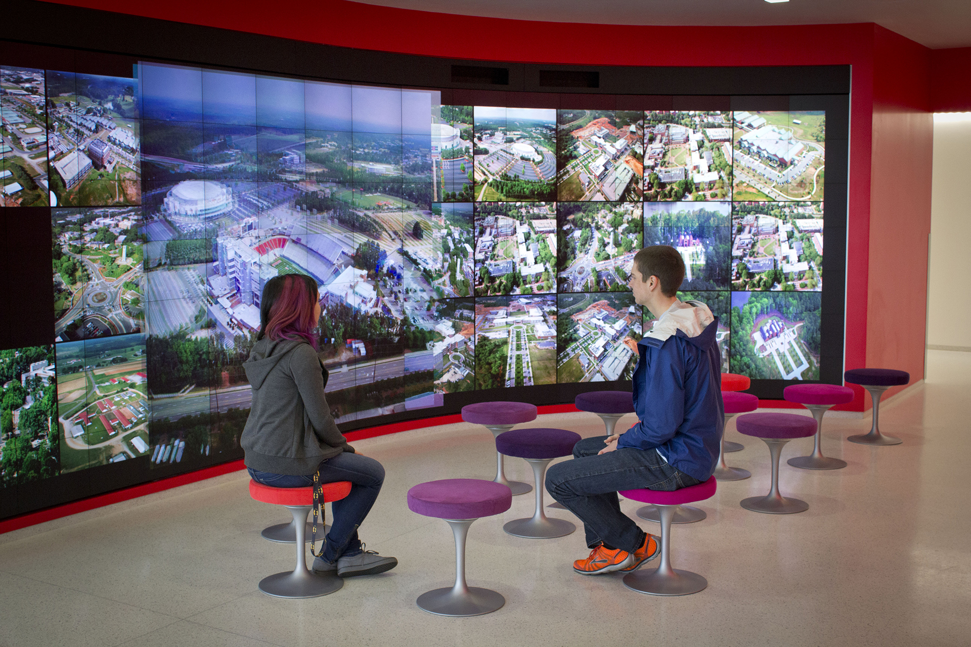 In the new 218,000 SF Hunt Library, NC State seeks nothing less than to create the best learning and collaborative space in the country. The signature, iconic building is being designed to promote interaction and collaboration among students, faculty, staff, and affiliates. The Library Orientation area features the Immersion Theatre with a 7’ x 18’ curved videowall. In the mezzanine, a 10’ x 8’ “microtile” stair wall displays student art, and doubles as a giant video wall during basketball season. In the Gallery, infrastructure is in place to support interactive exhibits.