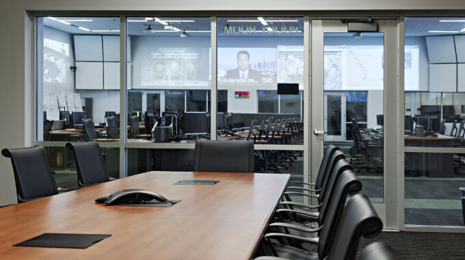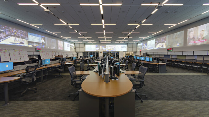 Highlighting the facility is a 75-person crisis operations room functioning as the central command and control space, where management decisions and coordinated responses are orchestrated. Twenty-four projectors display real-time data, proprietary media feeds (both public and secure), and first-responder communications onto surrounding wall surfaces, providing everyone full access to all relevant information. Several flat panel displays are mounted throughout the room to provide staff with quick status updates.