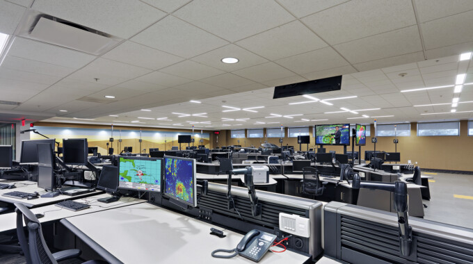 Pima County’s (Arizona) new Emergency Center is a fast response, technology-enabled facility, housing an Operations Center and a Public Safety Answering Point (PSAP). The 60,000 SF building contains state-of-the-art audiovisual systems including high-definition plasma displays and telecommunications infrastructure. Four breakout rooms and over 60 work stations allow multiple agencies to coordinate during a major emergency. The center also includes instant press conference capabilities, plus a highly mediated operations breakout room, logistics breakout room, and planning breakout room.