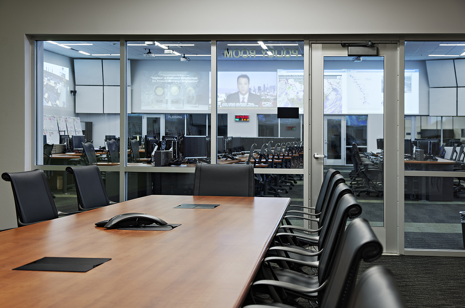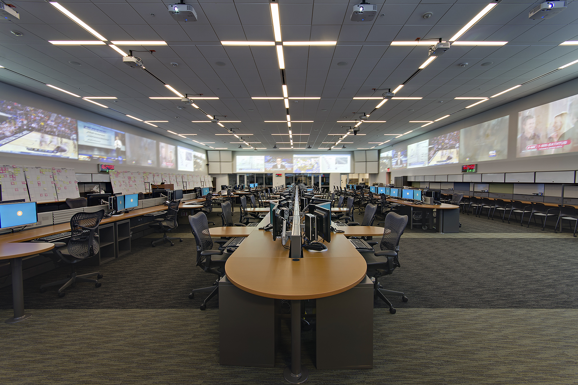 Highlighting the facility is a 75-person crisis operations room functioning as the central command and control space, where management decisions and coordinated responses are orchestrated. Twenty-four projectors display real-time data, proprietary media feeds (both public and secure), and first-responder communications onto surrounding wall surfaces, providing everyone full access to all relevant information. Several flat panel displays are mounted throughout the room to provide staff with quick status updates.