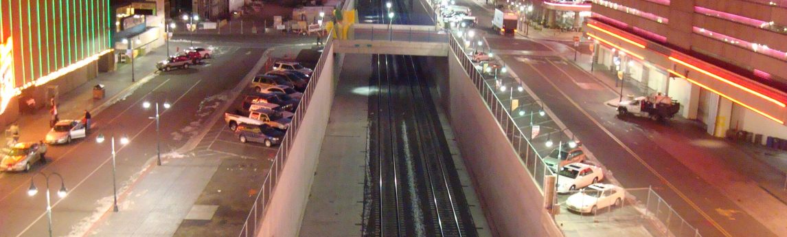 Located along the existing Union Pacific Railroad corridor in downtown Reno, the design-build project comprises a 34-foot deep train trench below the existing tracks, to isolate train traffic from vehicular traffic; two mainline tracks; an access road adjacent to the south side of the tracks; and 11 street crossings built as ‘bridges’ over the trench. A temporary track (shoofly) was built to ensure train travel was uninterrupted during construction of the trench.