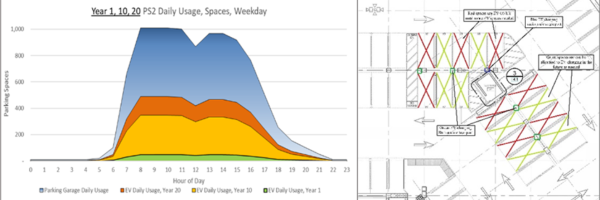 NV5’s EV analysis for the parking structure included research and modeling of EV adoption rates among County staff and San Mateo County residents, phased EV charging station buildout in the garage, analysis of various charging cost policy options on EV charging use and costs to the County and County employees, and a novel protocol for more efficient use of EV parking spaces in a full parking structure.
