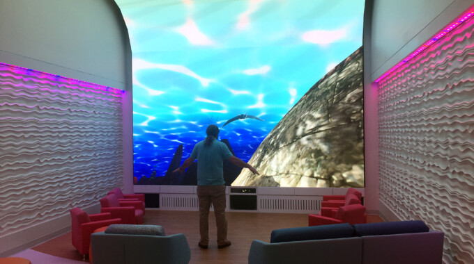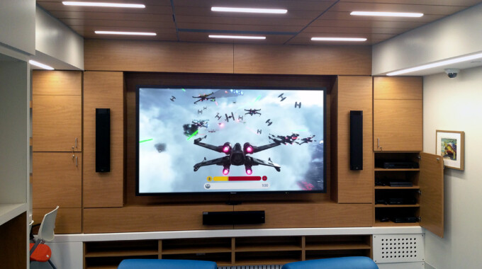 The Imagine Room’s audiovisual systems encourage patients to get out of their rooms and become absorbed in an immersive video experience. Through a gestural interface, children engage in imaginative simulation games such as flying through the jungle or traveling through outer space, and other custom-created content. Each of these distinct experiences deftly walks a fine line between controlling the game through fine motor skills and general body movement, allowing children of all ages and abilities the opportunity to interact with the wall to the best of their abilities. Patients unable to leave their rooms can experience activities within the Imagine Room via a camera feed encoded onto the building’s cable TV distribution system. The system even allows for simultaneous use of multiple input devices on the front wall, and includes a surround sound audio system. These ingenious yet cost-effective solutions deliver an environment where patients can play games, video chat, and spend time with friends and family. And maybe even contribute to their recovery.