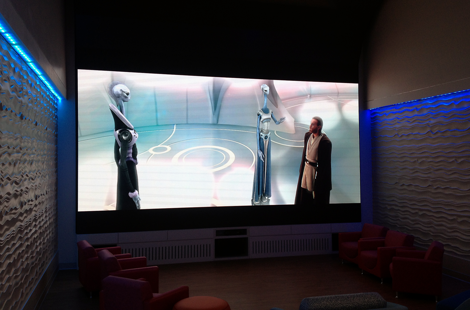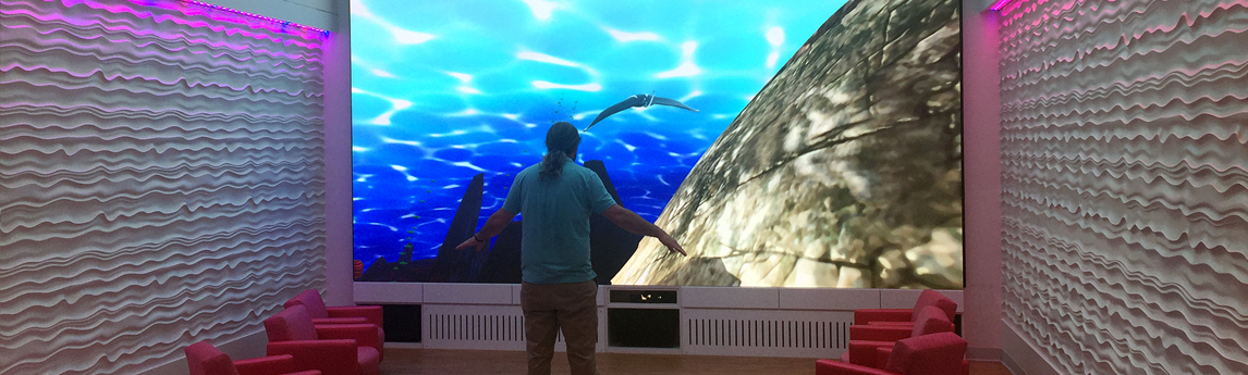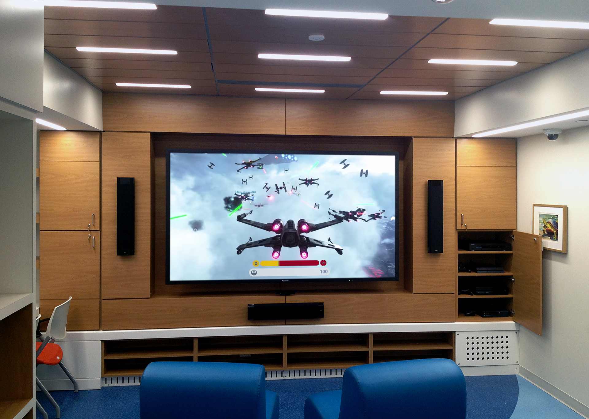 The Imagine Room’s audiovisual systems encourage patients to get out of their rooms and become absorbed in an immersive video experience. Through a gestural interface, children engage in imaginative simulation games such as flying through the jungle or traveling through outer space, and other custom-created content. Each of these distinct experiences deftly walks a fine line between controlling the game through fine motor skills and general body movement, allowing children of all ages and abilities the opportunity to interact with the wall to the best of their abilities. Patients unable to leave their rooms can experience activities within the Imagine Room via a camera feed encoded onto the building’s cable TV distribution system. The system even allows for simultaneous use of multiple input devices on the front wall, and includes a surround sound audio system. These ingenious yet cost-effective solutions deliver an environment where patients can play games, video chat, and spend time with friends and family. And maybe even contribute to their recovery.