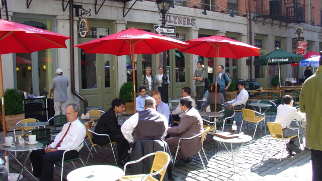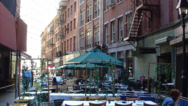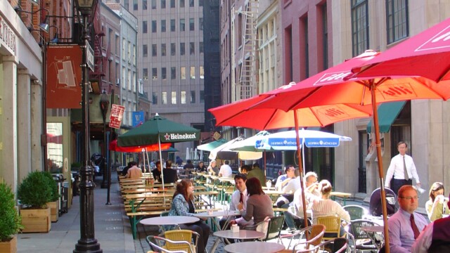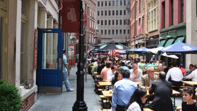 Design improvements included curbs and roadway, historic lighting and signage, movable tables and chairs, and new stone sidewalks.