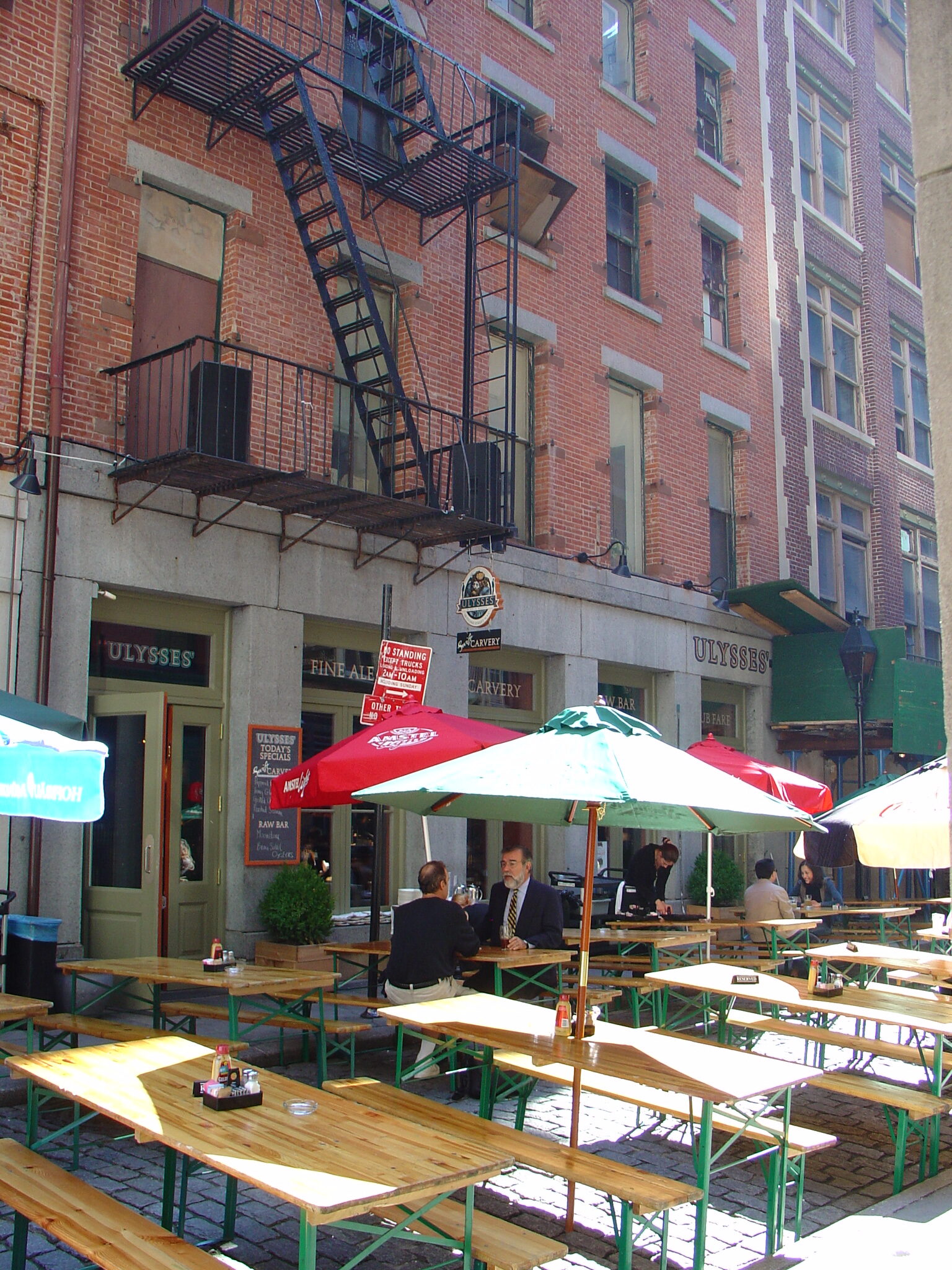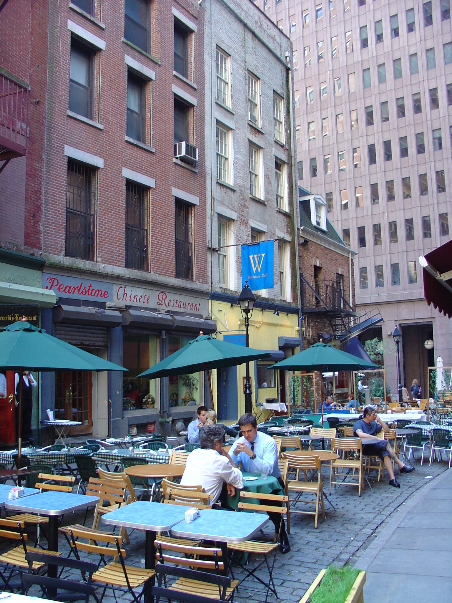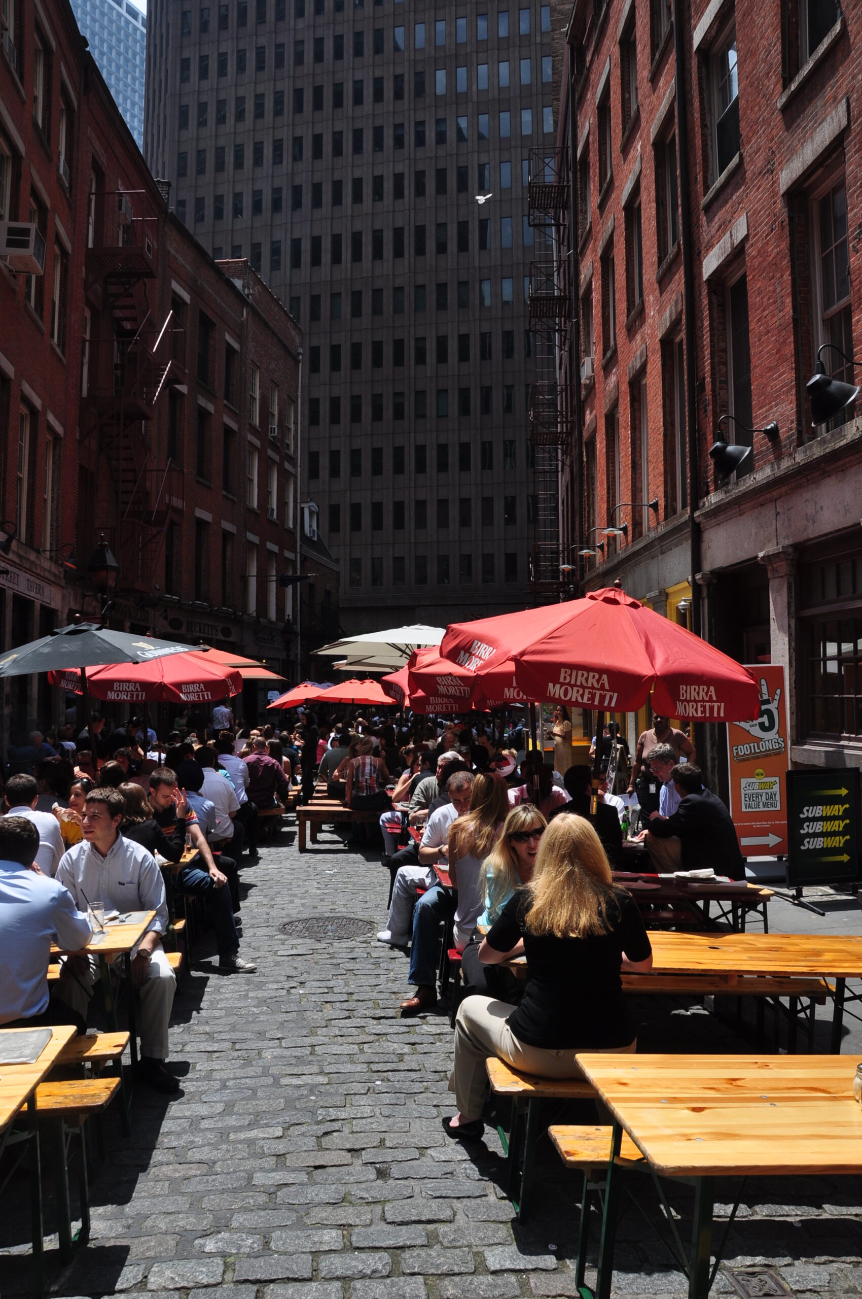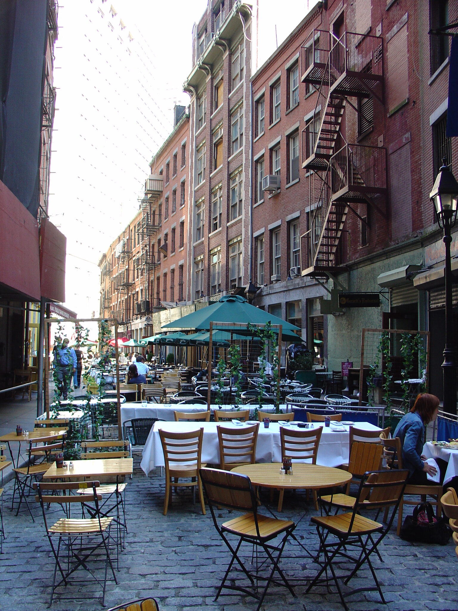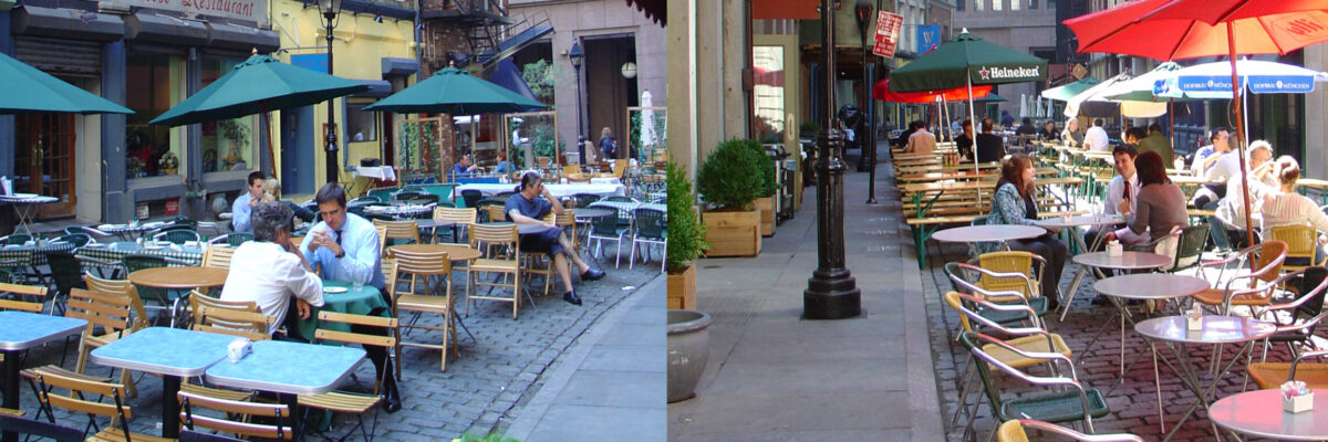 Design improvements included curbs and roadway, historic lighting and signage, movable tables and chairs, and new stone sidewalks.