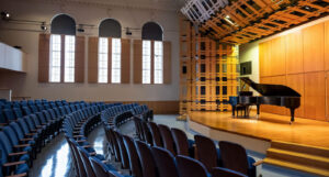 A dominant feature of the new 325-seat performance hall is the ingenious wooden basket-weave element suspended within the proscenium. This unusual enclosure is designed to both reflect sound and allow sound to pass into the space alongside and above it to produce a beautifully enhanced sound quality.