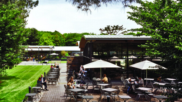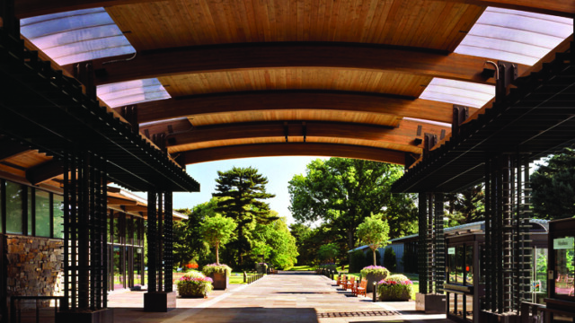 The design centers around a 450-foot long native, New York State, bluestone-paved central promenade lined with custom-designed steel planters, teak benches, low railings, and bollard lighting. The promenade terminates at a reflecting pool with granite coping. The design also features an outdoor dining terrace and plant shop. Sustainable features include permeable paving, native plantings, low-flow irrigation, and stone mulch xeriscape.