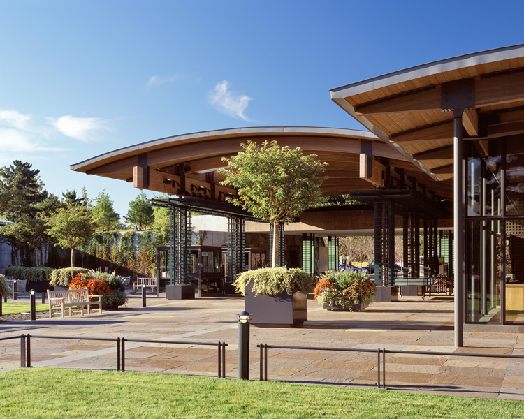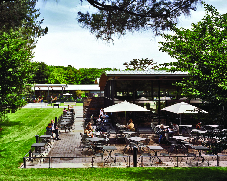 The design centers around a 450-foot long native, New York State, bluestone-paved central promenade lined with custom-designed steel planters, teak benches, low railings, and bollard lighting. The promenade terminates at a reflecting pool with granite coping. The design also features an outdoor dining terrace and plant shop. Sustainable features include permeable paving, native plantings, low-flow irrigation, and stone mulch xeriscape.