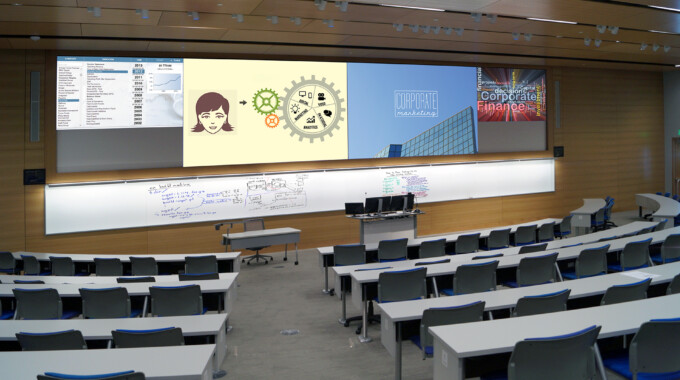 Packed with start-of-the-art technology, the 64,000 GSF facility contains five ALCs, all of which include raised access flooring and flexible furniture, allowing maximum flexibility and utility. These rooms accommodate high levels of distance learning, fostering collaboration between remote participants. Systems allow for any input to be routed to any input making audio, video, desktops, and files completely mobile. The 200-seat auditorium features flexible seating and a quad-projection system which uses edge blending technology to deliver stunning images. Adjacent, two 80-seat tiered ALCs host slightly more intimate sessions. Outside in the atrium, 20 flat panel displays comprise an impressive media wall, used for presentations and digital signage. The “Entrepreneurs Hall of Fame” is also in this space, highlighting the stories of successful businessmen and women.
