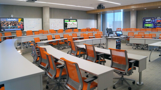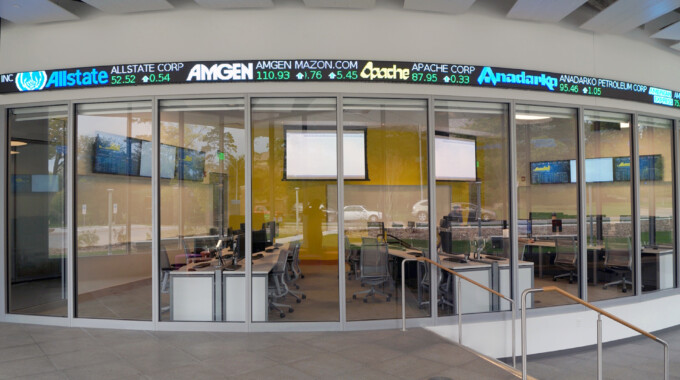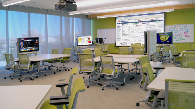 Behavioral research is conducted in the B-Lab. Administrators monitor trials distributing content from a central control room, which is behind one-view glass. Media content streams on displays in the clinical testing rooms, and video capture systems record the subject’s reaction. Results and consumer trends are then processed and analyzed in the control room. The Financial Lab acts as a mock trading room and doubles as a computer lab. A stock ticker informs students of the real-time status of the market. In addition, flat panel displays broadcast financial news streams, data, and world clocks. Prototypes are built and tested in the innovation lab. This large, open space has flexible furniture, allowing students to collaborate freely as they set the foundations of their business. Each semester, students can reserve one of twelve breakout rooms, which serve as their home base and business development office for the duration of their project.