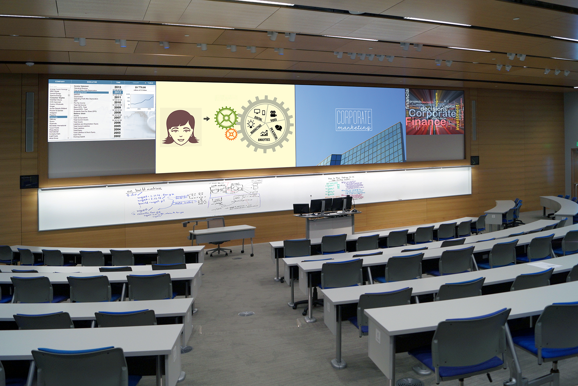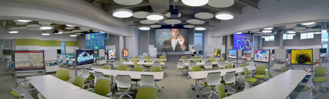 Packed with start-of-the-art technology, the 64,000 GSF facility contains five ALCs, all of which include raised access flooring and flexible furniture, allowing maximum flexibility and utility. These rooms accommodate high levels of distance learning, fostering collaboration between remote participants. Systems allow for any input to be routed to any input making audio, video, desktops, and files completely mobile. The 200-seat auditorium features flexible seating and a quad-projection system which uses edge blending technology to deliver stunning images. Adjacent, two 80-seat tiered ALCs host slightly more intimate sessions. Outside in the atrium, 20 flat panel displays comprise an impressive media wall, used for presentations and digital signage. The “Entrepreneurs Hall of Fame” is also in this space, highlighting the stories of successful businessmen and women.