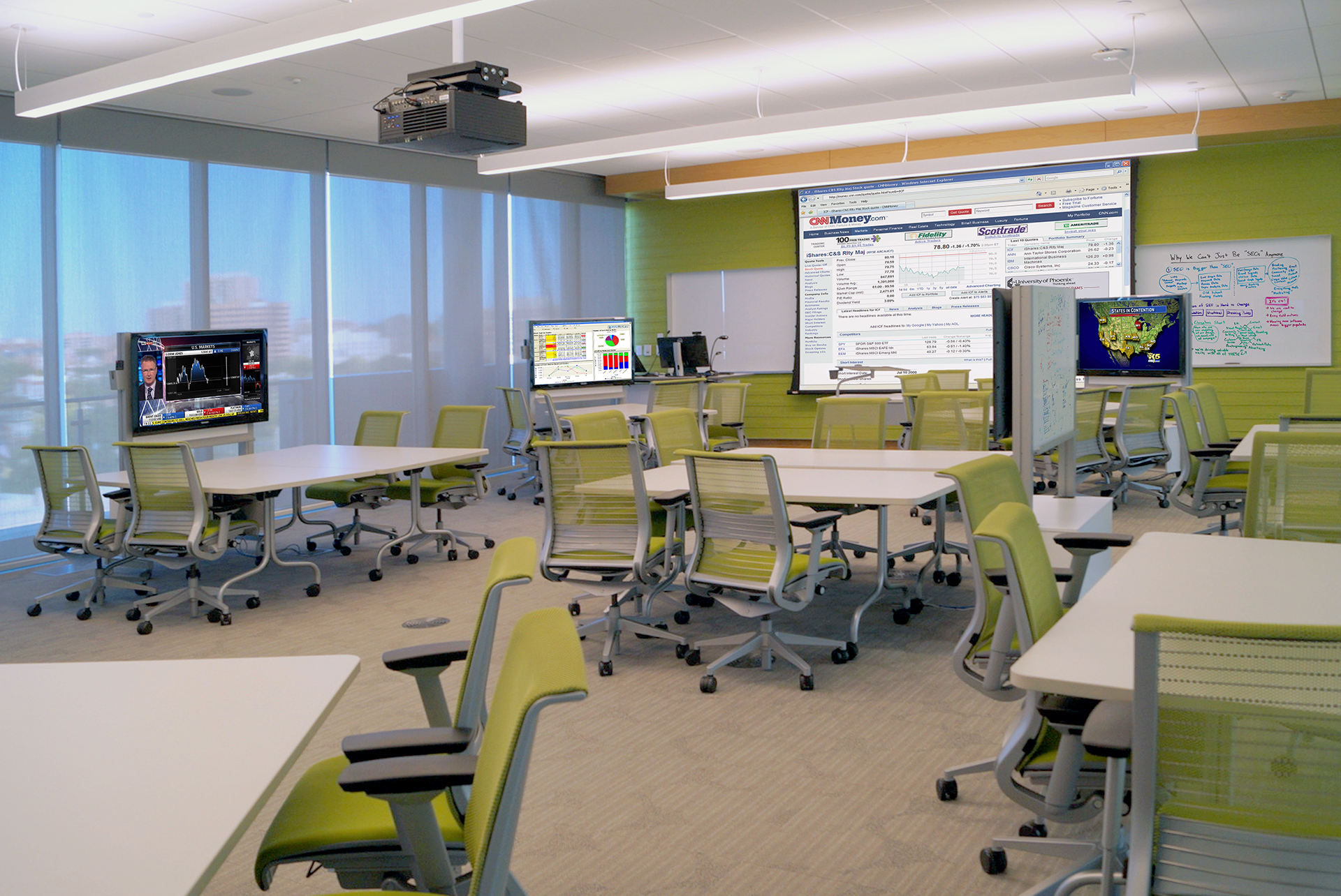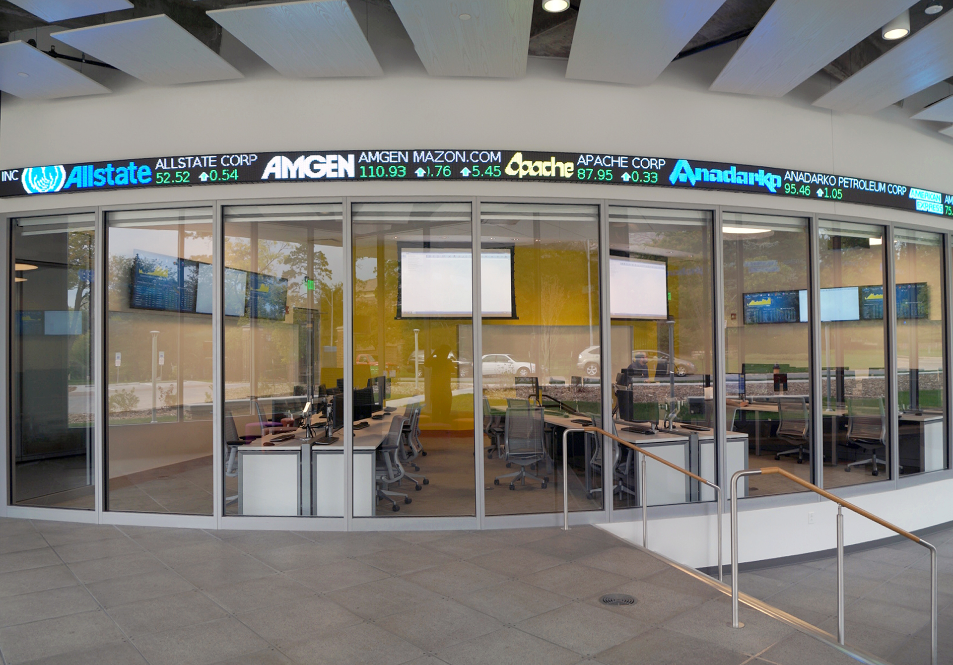 Behavioral research is conducted in the B-Lab. Administrators monitor trials distributing content from a central control room, which is behind one-view glass. Media content streams on displays in the clinical testing rooms, and video capture systems record the subject’s reaction. Results and consumer trends are then processed and analyzed in the control room. The Financial Lab acts as a mock trading room and doubles as a computer lab. A stock ticker informs students of the real-time status of the market. In addition, flat panel displays broadcast financial news streams, data, and world clocks. Prototypes are built and tested in the innovation lab. This large, open space has flexible furniture, allowing students to collaborate freely as they set the foundations of their business. Each semester, students can reserve one of twelve breakout rooms, which serve as their home base and business development office for the duration of their project.