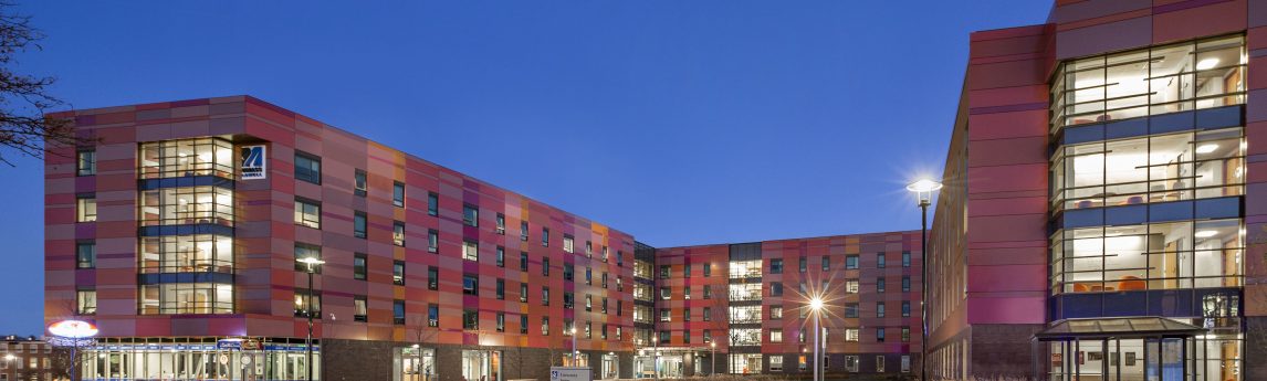 The University Suites project is a new 4- to 5-story residence hall building on the University of Massachusetts Lowell East Campus. The 147,000 SF building houses 472 beds in a suite style apartment setting.