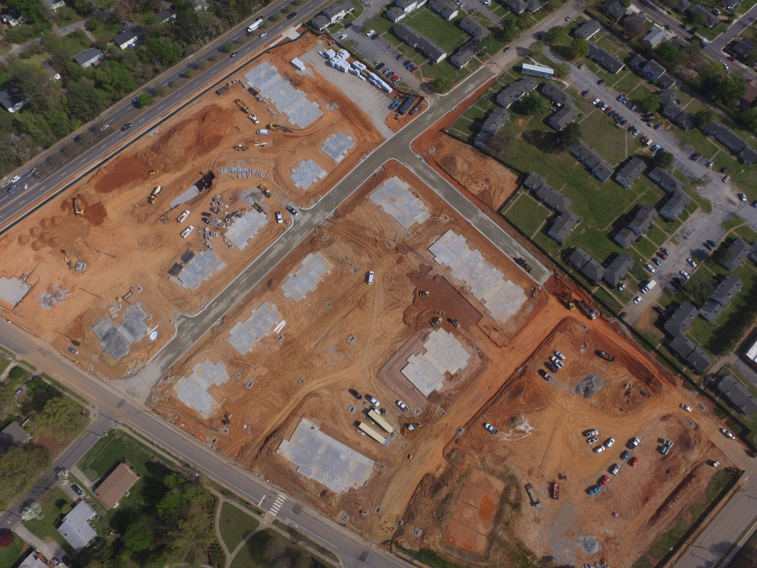 This 20-acre property in southeast Raleigh was the site of a low-income housing project developed in the 1940’s prior to its purchase by a local non-profit for redevelopment that will include single-family and multi-family homes and a senior living center.  Our services began with a Phase I environmental site assessment, as well as an evaluation of the presence of asbestos-containing building materials and lead-based paint.  Soil test borings and a geotechnical evaluation were performed to provide site development recommendations for the new buildings, new parking lots, new city streets, and stormwater control devices.  Since the onset of construction in 2017, NV5 has been involved, primarily on a full-time basis, to observe site grading operations, including testing of structural fill soils, and to perform foundation examinations and concrete testing for building construction.  Testing of pavement systems in the new parking lots and roadways is also underway.  We’re proud to provide our geotechnical and construction testing services on projects like Washington Terrace that provide affordable housing for Raleigh residents.