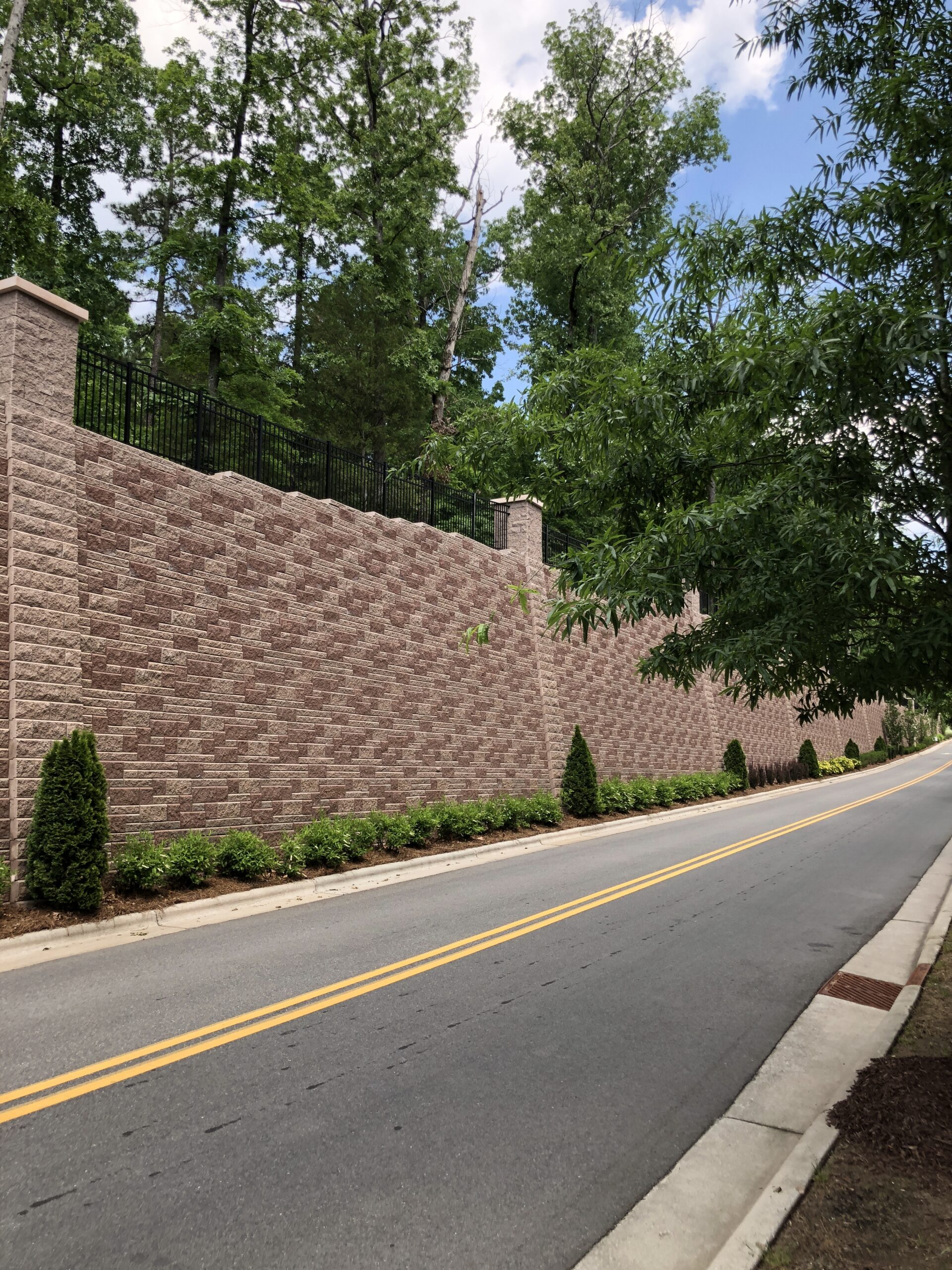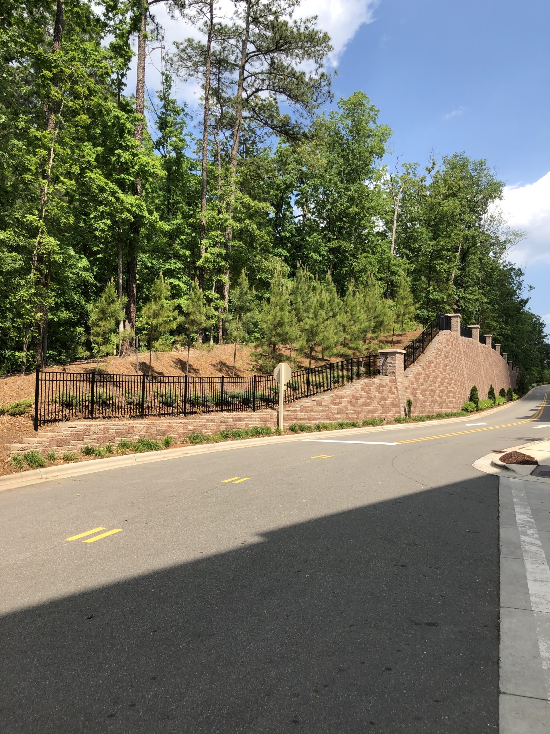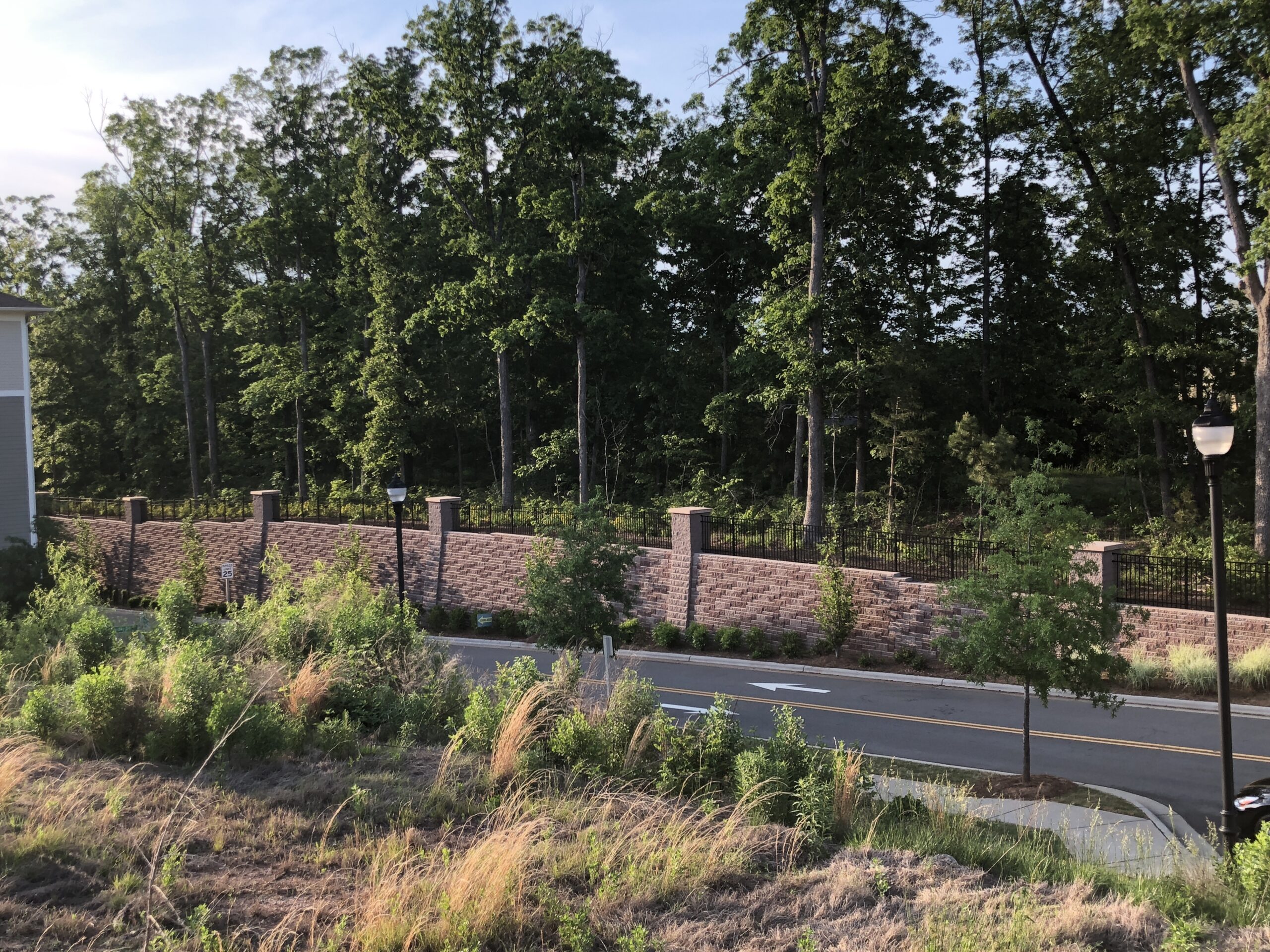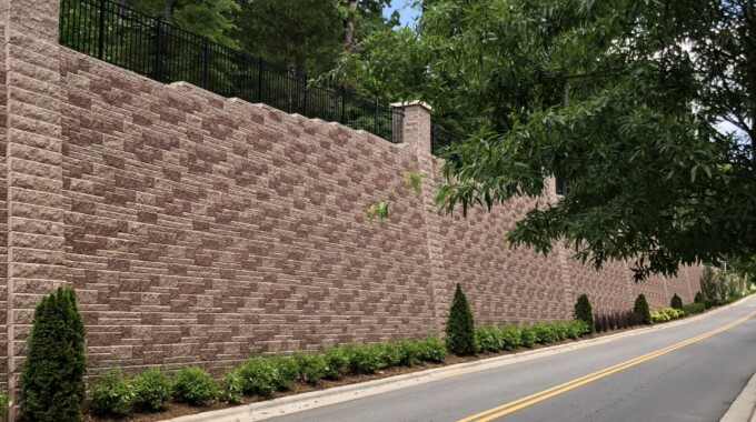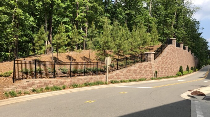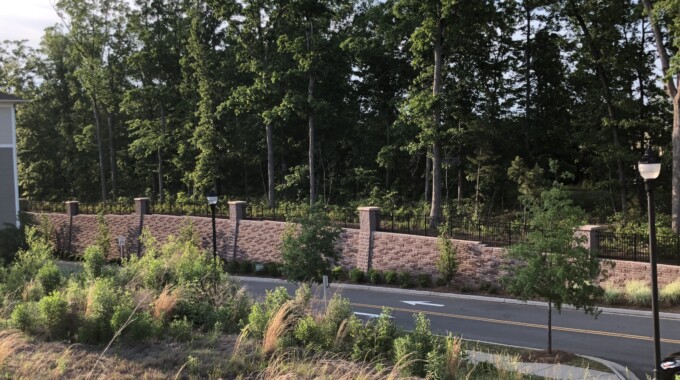 The Weston Corners mixed-use project in Morrisville encompasses approximately 20 acres of land at the intersection of NC Highway 54 and Weston Parkway. The mixed-use facility at this site includes a combination of apartments, townhomes, a precast parking garage, and retail buildings. Our involvement began in 2009 when the developer asked us to evaluate subsurface conditions, especially the depth and consistency of rock at the site. Due to the topographic conditions, along with the Durham Triassic Basin geology at the site, mass grading costs were expected to be high, and the need for significant retaining wall structures was expected. The project was put on hold until 2013 when NV5 performed a Phase I environmental site assessment and provided retaining wall design services for the 14 segmental retaining walls needed to accommodate the necessary grade changes. One of the walls, located along the northern edge of the property, incorporates a segmental block facing on a soil-nail structural wall. Because of the height and length of the wall, the developer was concerned about aesthetics, so NV5 worked with the owner and the site development contractor to create a design that incorporates columns within the wall and masonry piers as fence posts above the wall to provide a pleasing appearance. This wall won an award as 2017 Retaining Wall Project of the Year by the Hardscape North America conference. NV5 was involved during wall construction and also provided testing services associated with wall construction and pavement construction at the site. This project exemplifies the way NV5 listens to a client’s needs and helps create innovative solutions using sound engineering principles.