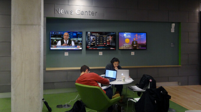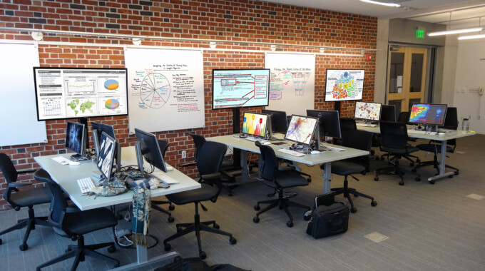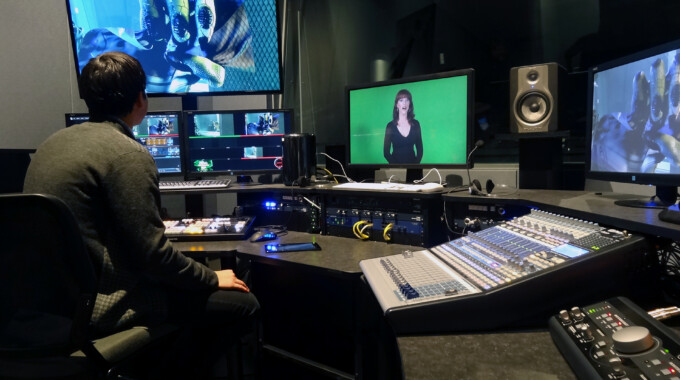 A main point of interest in the facility is the Video Conference Room. This 20-seat room contains two 103-inch flat panel displays, which supply high-quality video presence and communication with other facilities at remote locations. With such teleconferencing technology, foreign language students can chat with native speakers overseas, instructors can team-teach with professors at other institutions, and faculty and students can engage in cross-collegiate learning without having to leave campus. The Media Production Studio is a fully operative studio equipped for video, audio, and music recording. The studio includes multiple cameras, a teleprompter, various microphones, and a studio lighting system. Within the studio space is an isolation booth for voice or single instrument recording and adjacent to the facility are video editing and MIDI suites. This space was designed to allow students of all disciplines to integrate multimedia projects into their academics.
