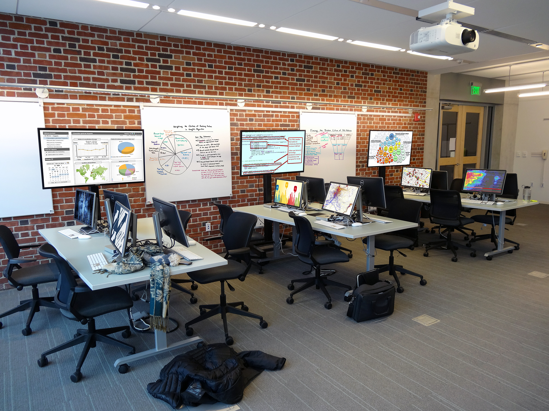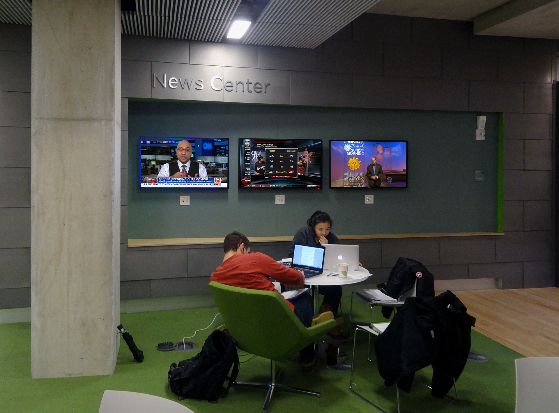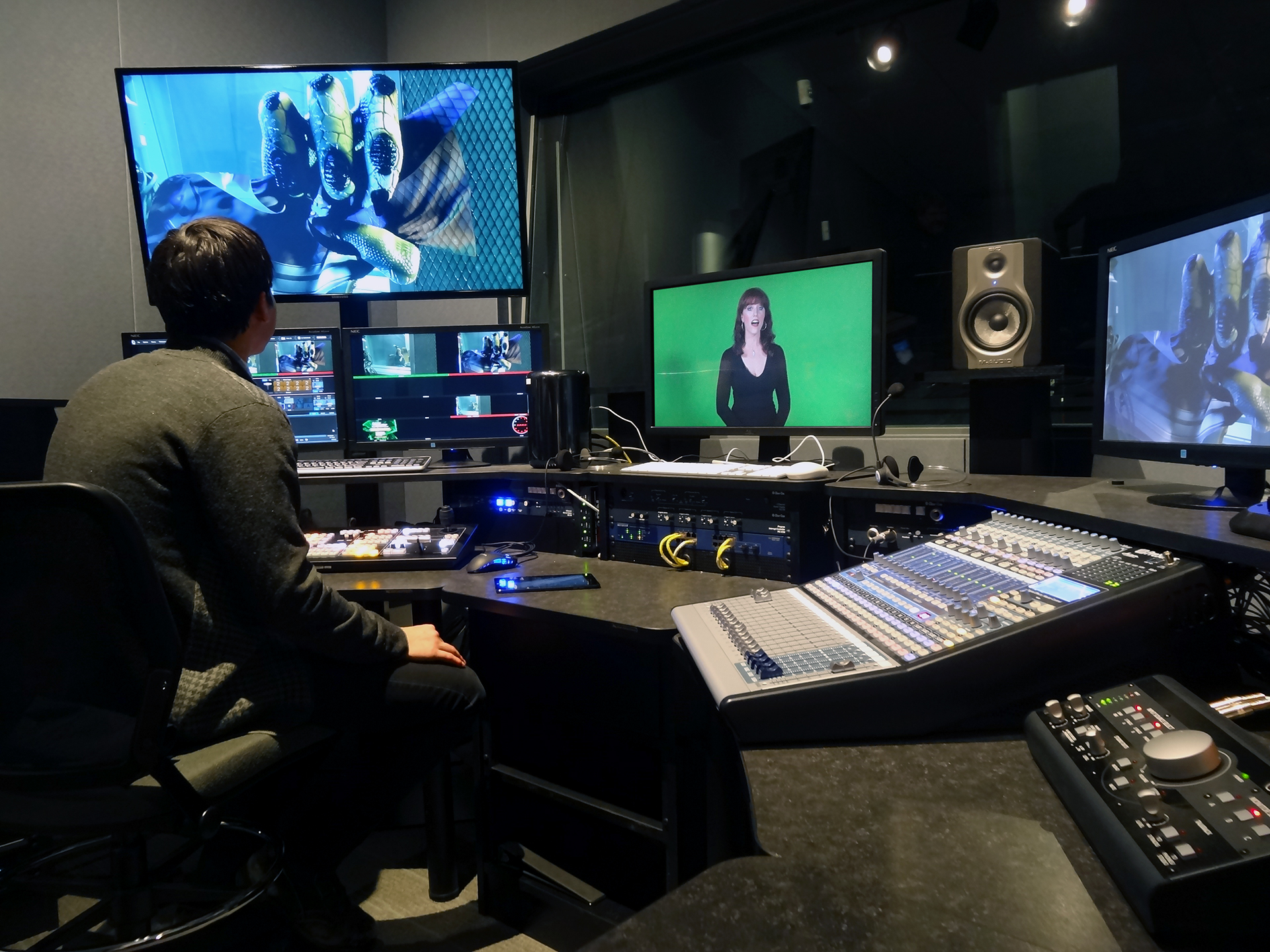A main point of interest in the facility is the Video Conference Room. This 20-seat room contains two 103-inch flat panel displays, which supply high-quality video presence and communication with other facilities at remote locations. With such teleconferencing technology, foreign language students can chat with native speakers overseas, instructors can team-teach with professors at other institutions, and faculty and students can engage in cross-collegiate learning without having to leave campus. The Media Production Studio is a fully operative studio equipped for video, audio, and music recording. The studio includes multiple cameras, a teleprompter, various microphones, and a studio lighting system. Within the studio space is an isolation booth for voice or single instrument recording and adjacent to the facility are video editing and MIDI suites. This space was designed to allow students of all disciplines to integrate multimedia projects into their academics.