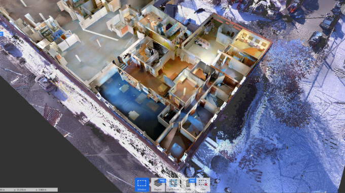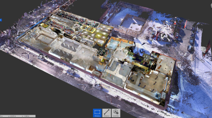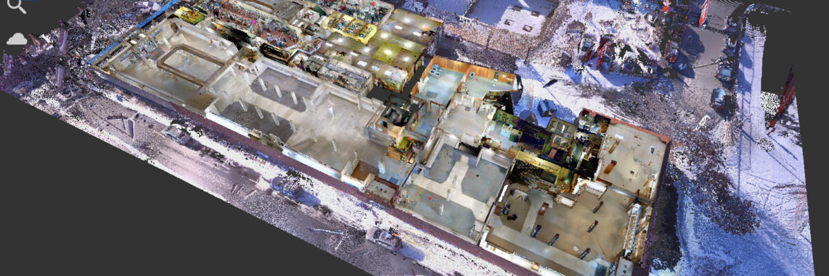 This six-level commercial building, totaling 113,681 sf, was scanned over three days using NavVis VLX mobile and Trimble X7 tripod-mounted equipment. The scope included full interior coverage from the basement through the fifth floor, along with exterior scanning from the ground. All scans were captured in color, and drone imagery was used to document the roof and upper exterior elevations.