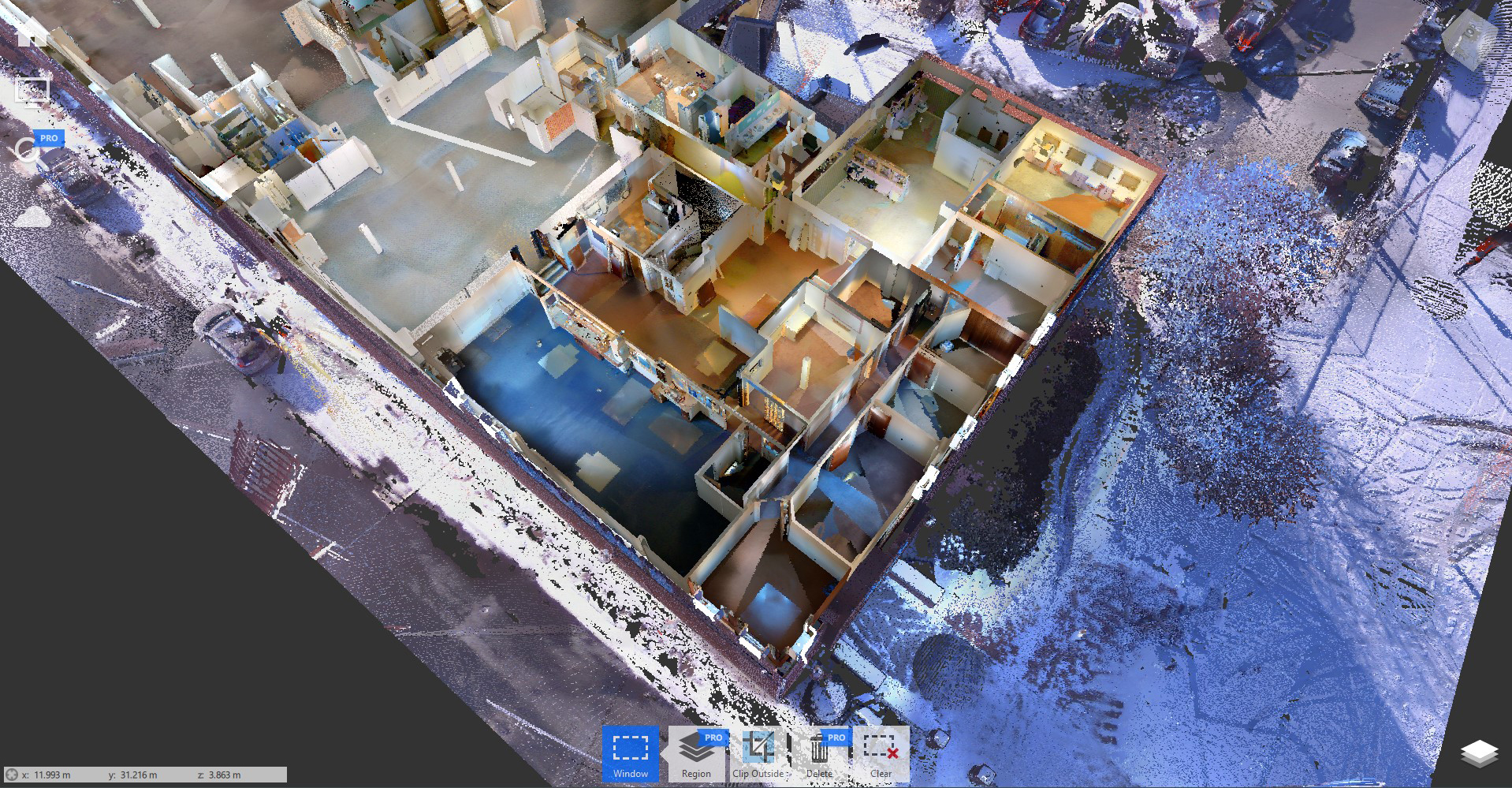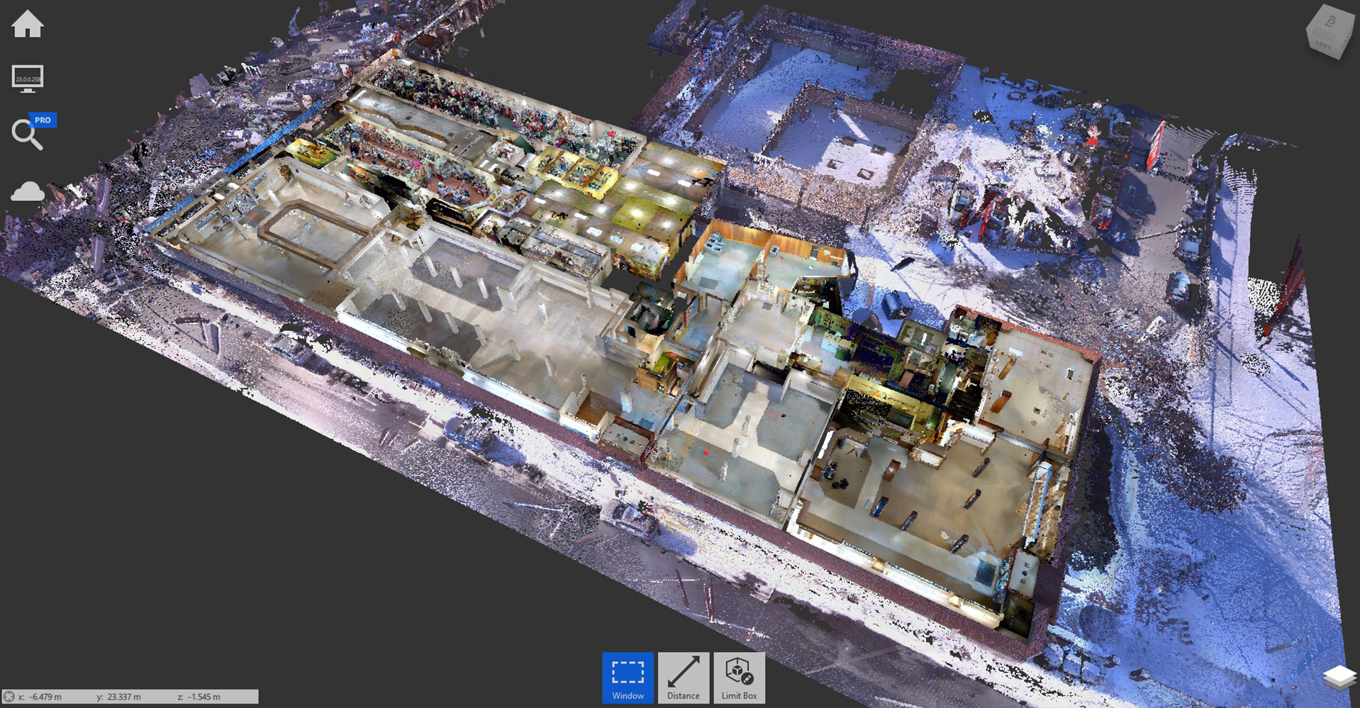 This six-level commercial building, totaling 113,681 sf, was scanned over three days using NavVis VLX mobile and Trimble X7 tripod-mounted equipment. The scope included full interior coverage from the basement through the fifth floor, along with exterior scanning from the ground. All scans were captured in color, and drone imagery was used to document the roof and upper exterior elevations.